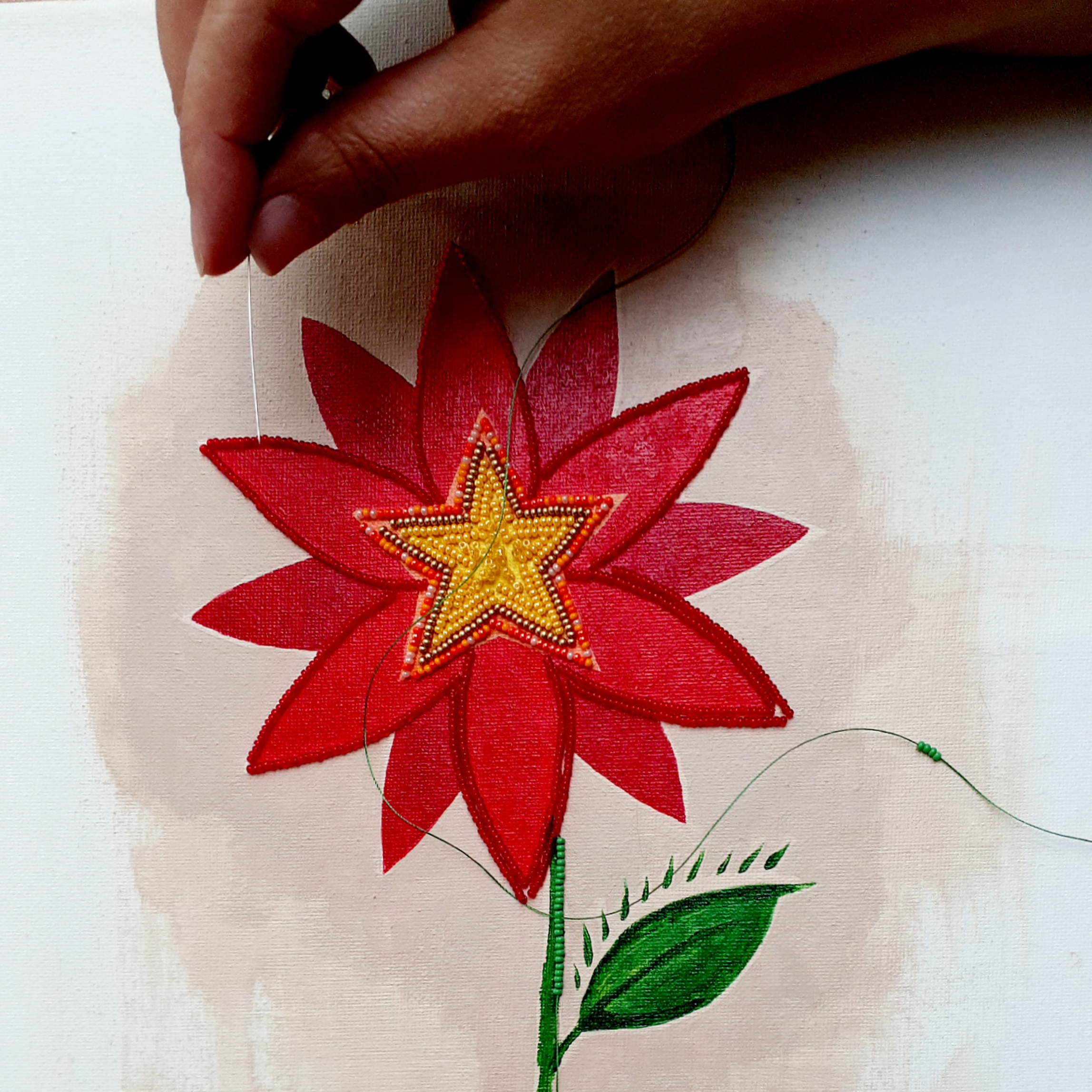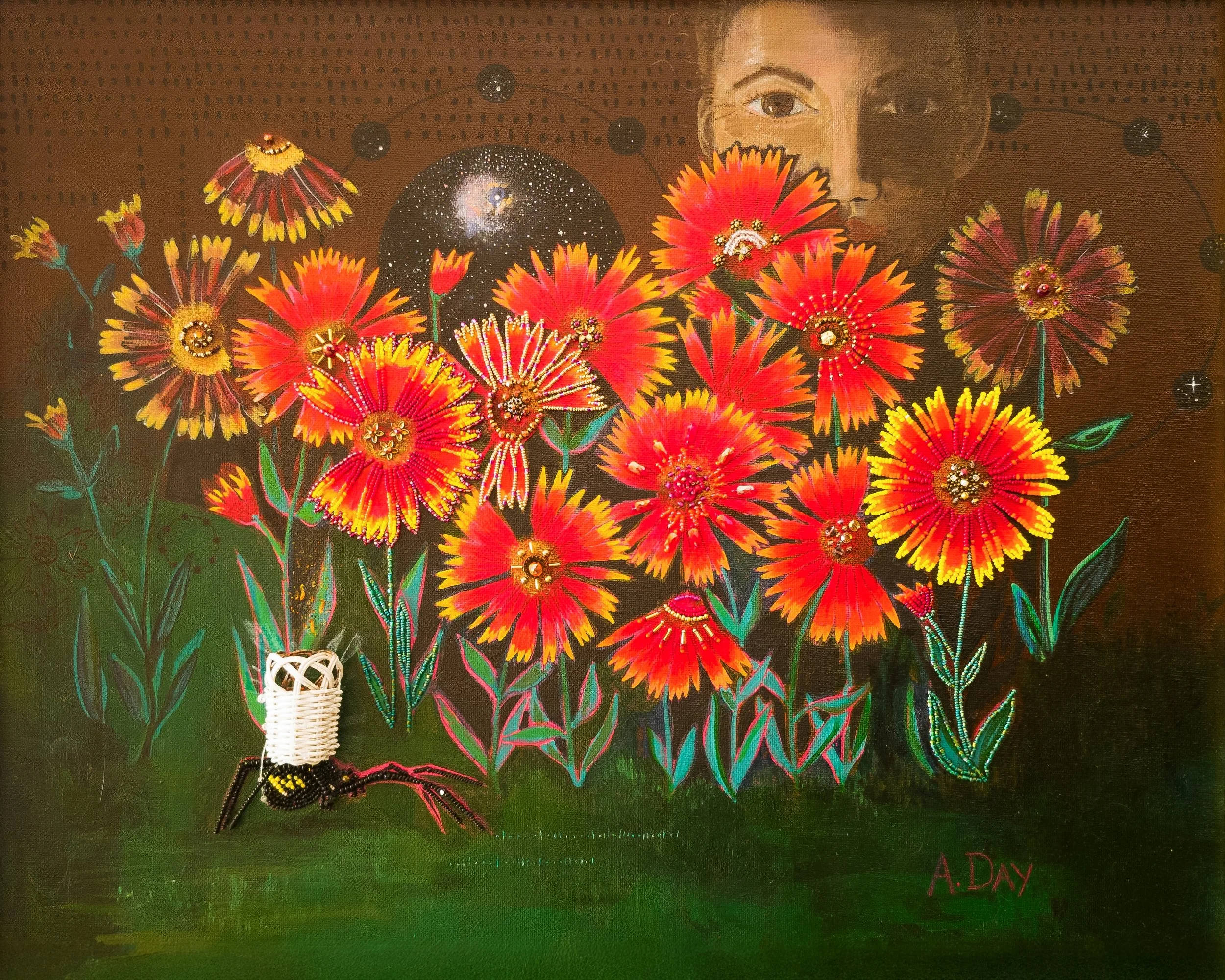 Andrea Day is the originator of Acrybead™, a contemporary medium combining acrylic paint with hand-sewn glass seed beads on canvas. Her work reclaims and evolves pre-Removal Mvskoke beadwork traditions, particularly the intuitive, improvisational style rarely practiced today, creating a dialogue between ancestral design, lived experience, and future vision.
